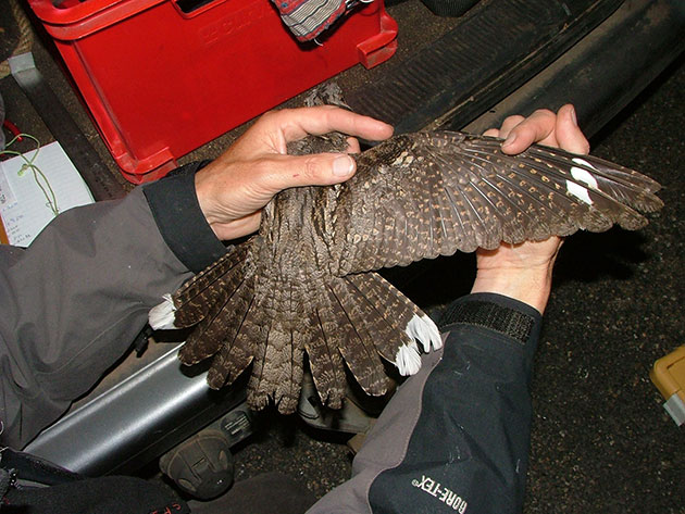 The birds are lured to the net through recorded nightjar song, mainly attracting male birds trying to defend their own territory. Caught birds are then measured, weighed and photographed. Unringed birds are ringed. Depending on the procedure, the birds are set free after 5 to 10 minutes.