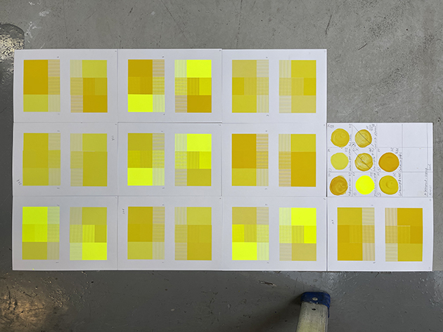 To experience how individual pigments manifest as color on paper, I bought 60 samples, processed them into a printable mixture, and screen-printed them using a standardized method using a 77T screen and a medium shore sqeegee..